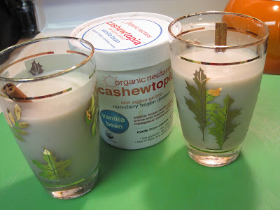 Cheater– lol- yes I am! I wanted a quick vegan snack! I was hanging out with one major meat eater and 2 vegetarians.. lol- they had to know we (vegans) can do fun shakes and snacks too! I really enjoy finding non health food stores that carry vegan items! When you think about it, dairy free items are on the rise and should be even more popular than they are due to the high rate of people who are lactose intolerant.This shake was really basic- just a banana and ice cream! The ice cream is made from cashew nuts. The brand I found here is from Organic Nectars: Cashewtopia!